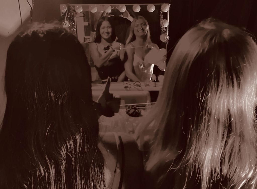 Audiences arrived in the blue-lit backstage area, with two women wearing negligee slips sitting at facing makeup tables a few feet apart, turning their heads around to look at each other. Throughout, their pre-recorded dialogue played in the background and the EDM music continued in the hall. I soon barged in as a club manager and told the characters that this was a big night, that a DJ from KIIX would be spinning, so SELL SELL SELL that liquor; the bar got a big shipment in before the tariffs. They had about eight minutes to get ready.