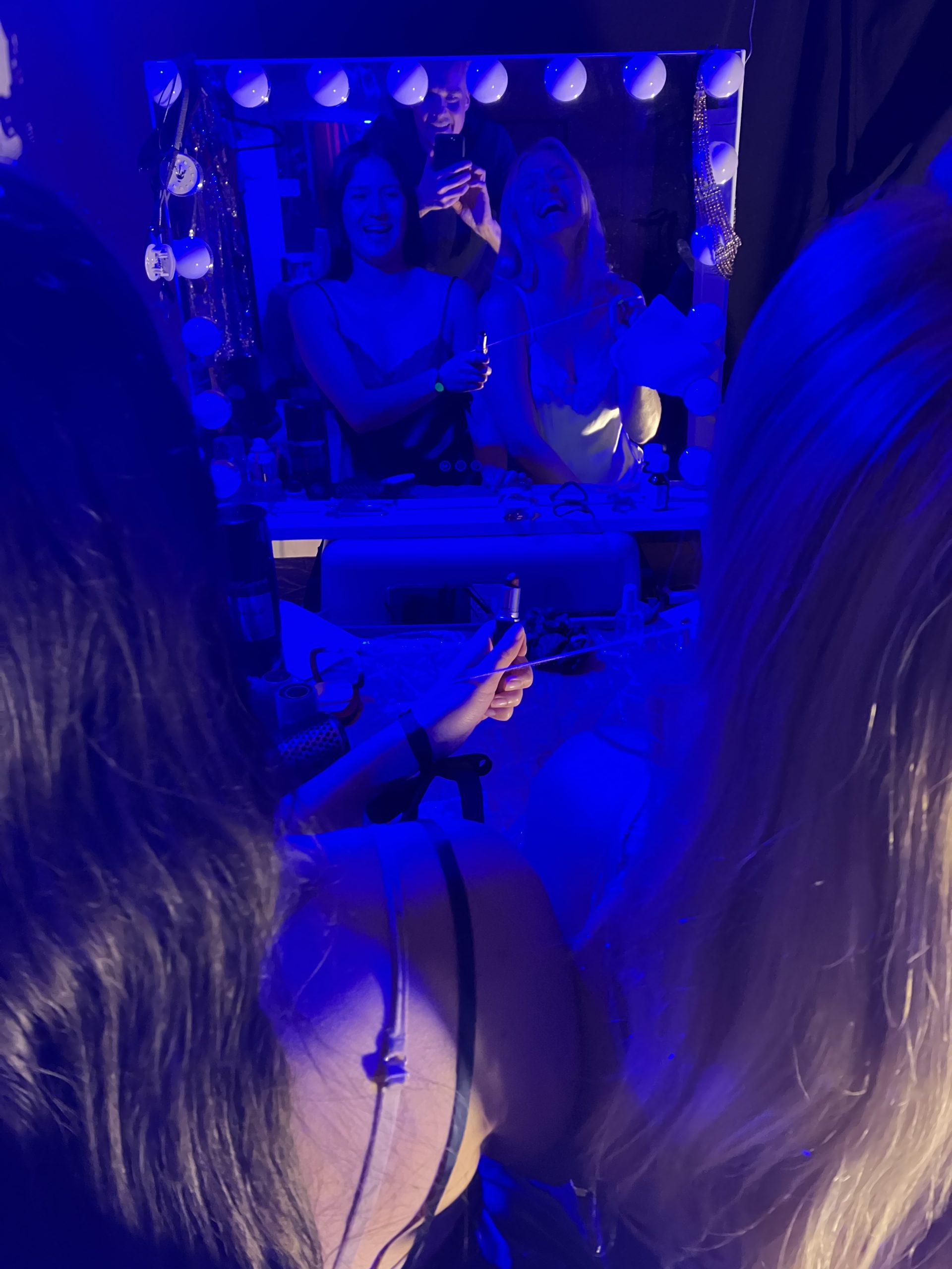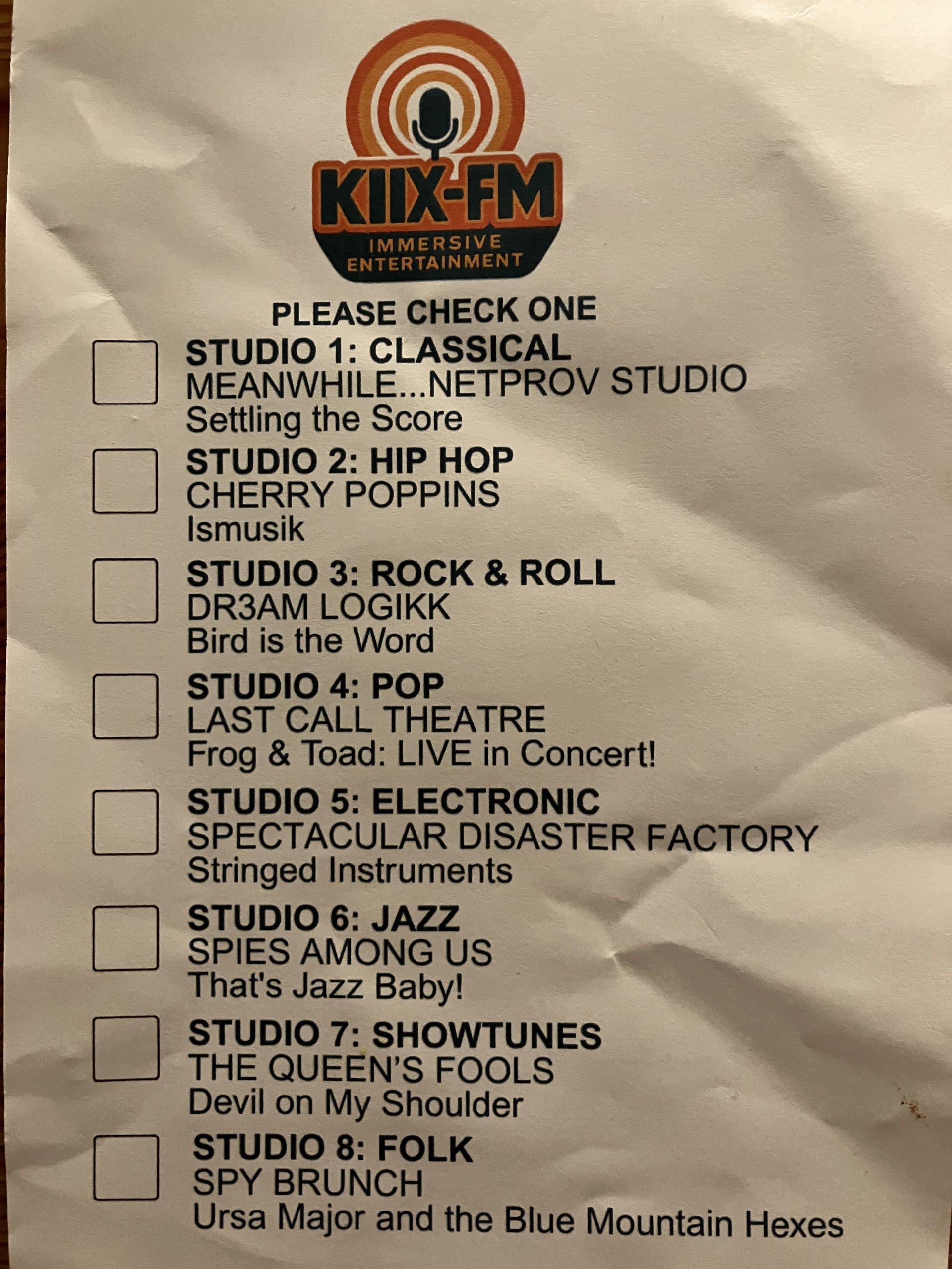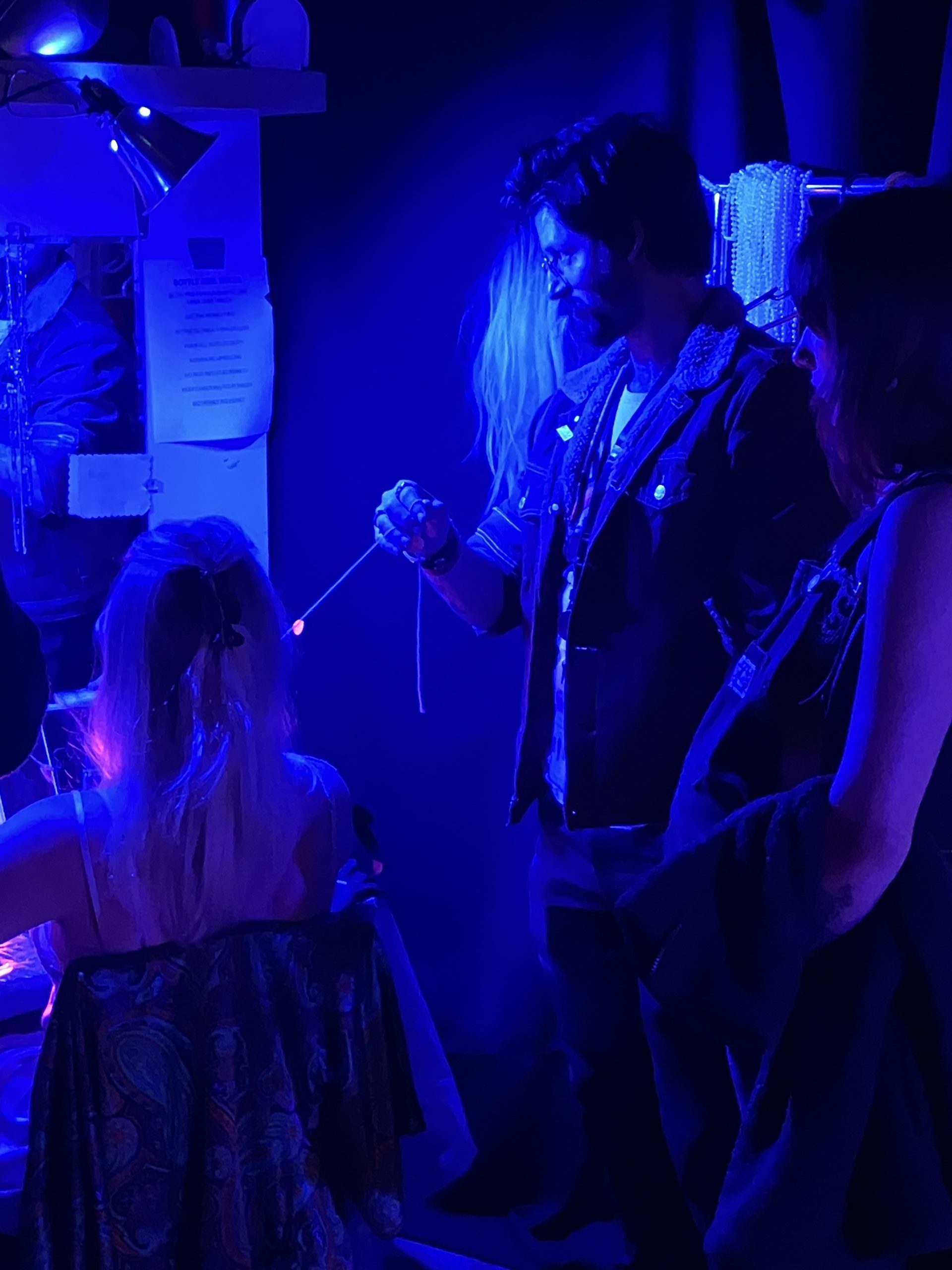 We were honored to be invited to the 2025 Los Angeles Immersive Invitational with seven other immersive groups: Cherry Poppins ∙ Dr3am Logikk ∙ Last Call Theatre ∙ Meanwhile… netprov Studio ∙ The Queen’s Fools ∙ Spies Among Us and Spy Brunch – and we all had fewer than 48 hours to create a 10-minute immersive experience given a theme (music), random genre (for us, electronica), space (for us, a long hallway and backstage green room at the LGBT Center in Hollywood) and a prop (we picked a pink bike light).